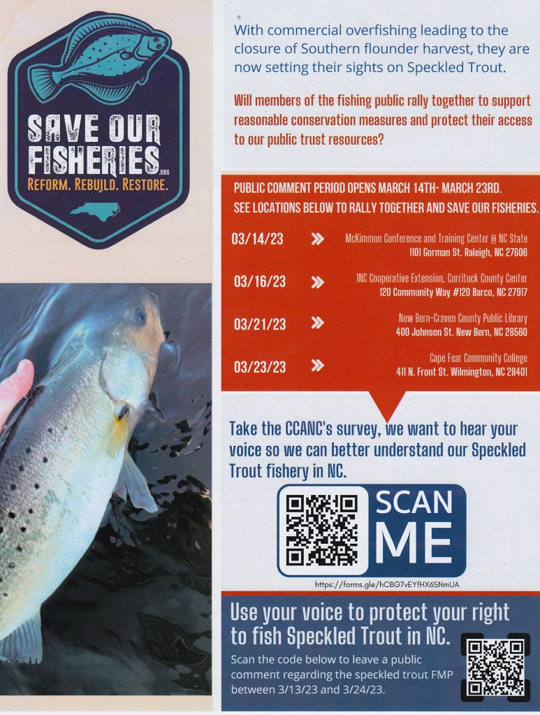 Matthew Wallin, Eastern Regional Director of the Coastal Conservation Association of NC gave an interesting talk about the goals of the CCA and pending NC legislation restricting fishing for Speckled Trout. He encouraged the membership to use their voices to protect their rights to fish for Speckled Trout. If this is a concern to you and you want more infomation please go to: –