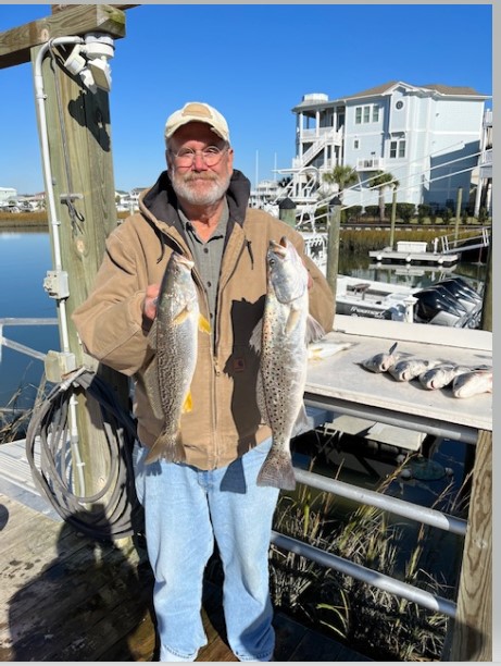 Jim has owned several boats with his current one being a 2019 Boston Whaler Montauk 170 that he keeps at the newly opened Calabash Marina. Jim is still learning the tricks of the trade in fishing the Intracoastal Waterway, but has benefited greatly on several charter trips with other members of the club. Recently, Jim was featured with friends Alan Trojan and Clint Morschauser, in an article published in The Brunswick Beacon after a local, very successful, fishing trip with Captain Tripp Hooks. The team scored big and had to throw back many trout after meeting the limit for the boat. An avid fisherman, Jim’s favorite saying is “The tug is the drug”!