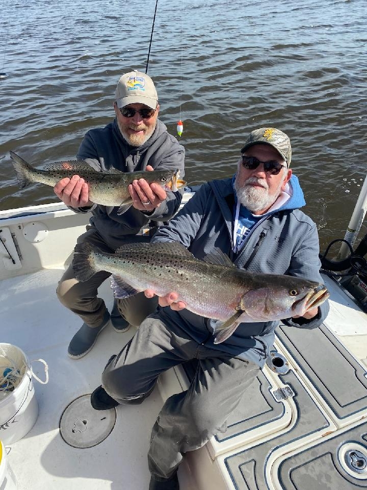 Club Members Dwain Benton and Roy Coffey holding some of their catch from this past Saturday. They were on a charter with Captain Tripp Hooks. The larger fish statistics are 7 lb. 15 oz, 28″ and the smaller fish is 23-1/2″. They were both caught at the jetties on live shrimp. This is two of 14 trout, several reds, and at least one black drum caught.