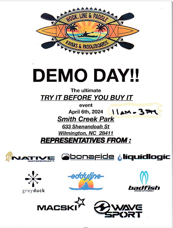Hey kayakers and wannabes, here is an opportunity to try out a kayak. Sit inside, sit on top models, fishing yaks and recreational models, as well as paddleboards…over 30 models. Try them for free at this Demo Day event! Representatives from several companies will be there. Organized by Hook, Line and Paddle. Tell Chris I sent you.