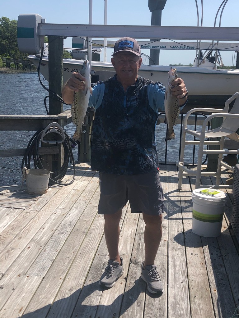 Jim has owned several boats with his current one being a 2019 Boston Whaler Montauk 170 that he keeps at the newly opened Calabash Marina. Jim is still learning the tricks of the trade in fishing the Intracoastal Waterway, but has benefited greatly on several charter trips with other members of the club. Recently, Jim was featured with friends Alan Trojan and Clint Morschauser, in an article published in The Brunswick Beacon after a local, very successful, fishing trip with Captain Tripp Hooks. The team scored big and had to throw back many trout after meeting the limit for the boat. An avid fisherman, Jim’s favorite saying is “The tug is the drug”!