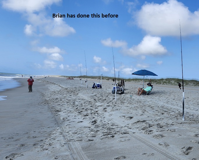 Not so sure that Bob arranged to have the big ones show up for this event. A lot of small fry were caught but a few of the really big one’s got away. I almost had a rod pulled out into the surf. It was saved by a nearby beach jogger! And Brian lost an unidentified lunker that broke off a 40-lb shock leader.