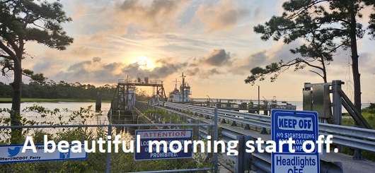Itinerary: 7:00 to 7:30 AM – Drive on to the Ferry and enjoy the 20-minute scenic ride along the Cape Fear River to the Ferry Parking lot. Cost: $14/vehicle roundtrip.