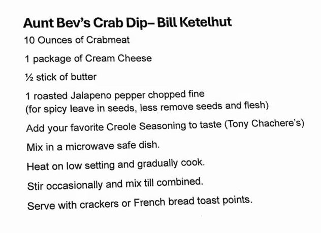 - Aunt Bev’s Crab DIp – by Bill Ketelhut